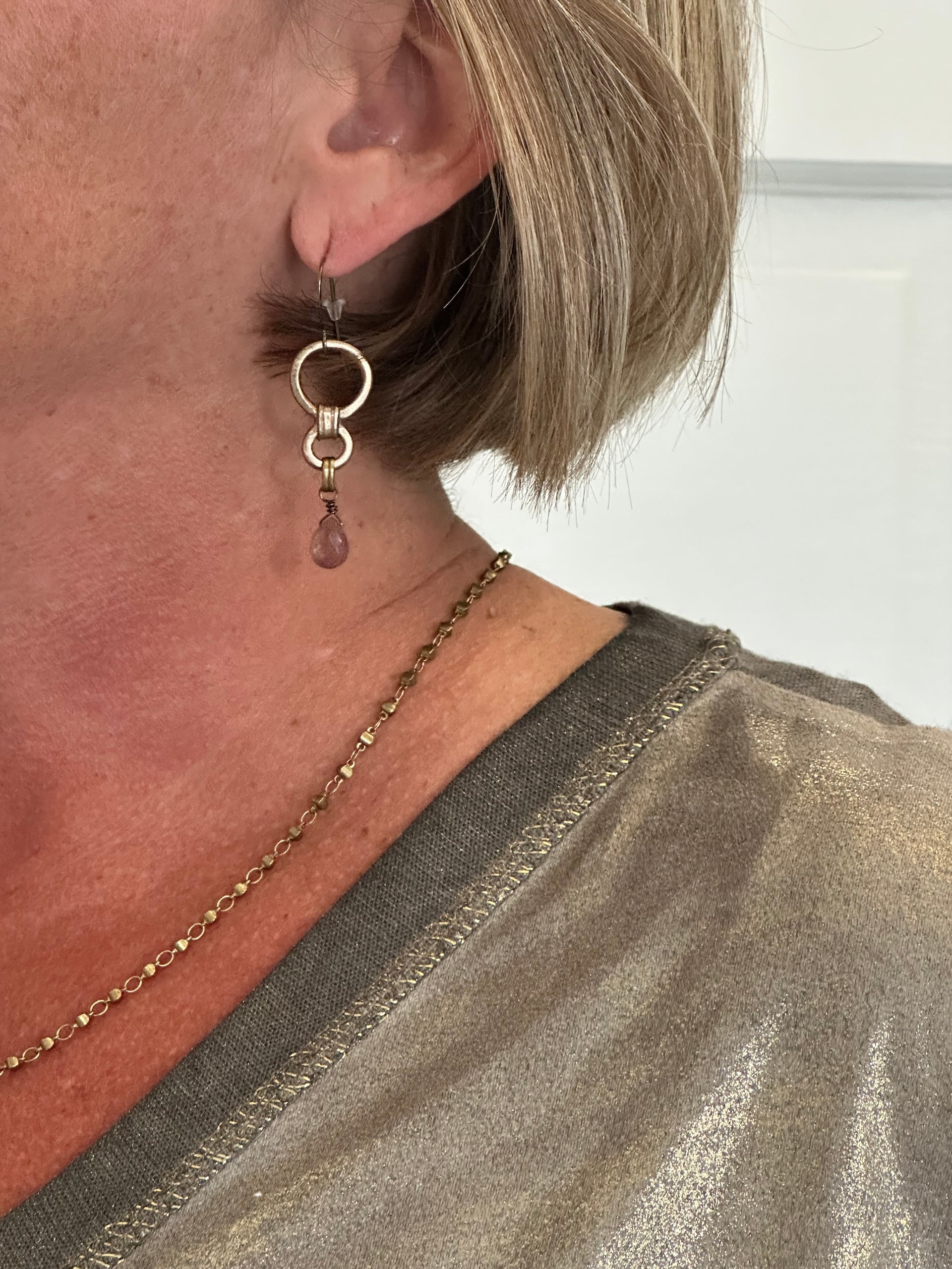 Add a touch of hand-crafted elegance to your outfit with our Earrings Double O-Ring W Gemstone Drop. Choose from stunning strawberry quartz or aqua kyanite briolette drops, designed by Tony Perrin of Nashville. Celebrate beauty with our bronze o-ring design.