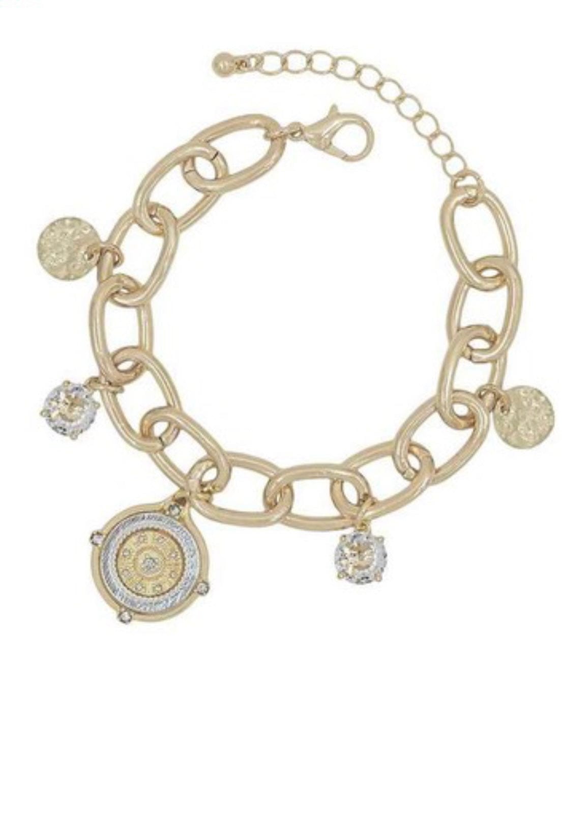 Experience elegance and luxury with our Gold Charm Bracelet. This adjustable piece features open links, gold tone accents, and stunning charms including a compass and gems. Embrace the world of art and fashion with this sophisticated addition to your jewelry collection.