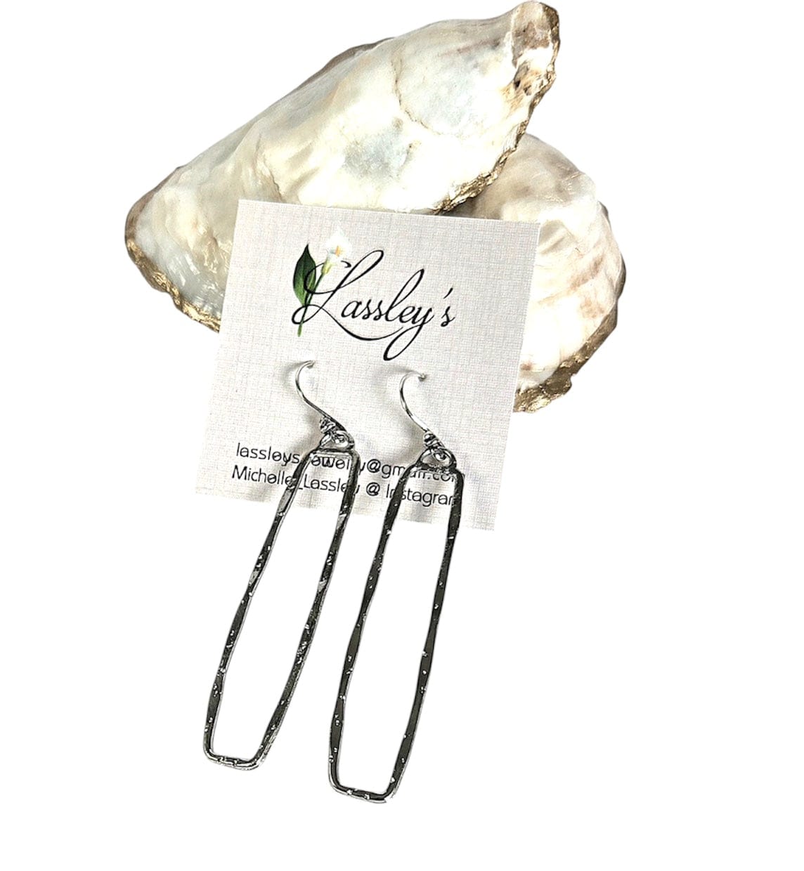 "Add a touch of modern and quirky style with these hammered silver earrings. The open rectangle design is both antique and modern, making these earrings a unique conversation piece. Make a statement with these fun and stylish bar-shaped earrings."