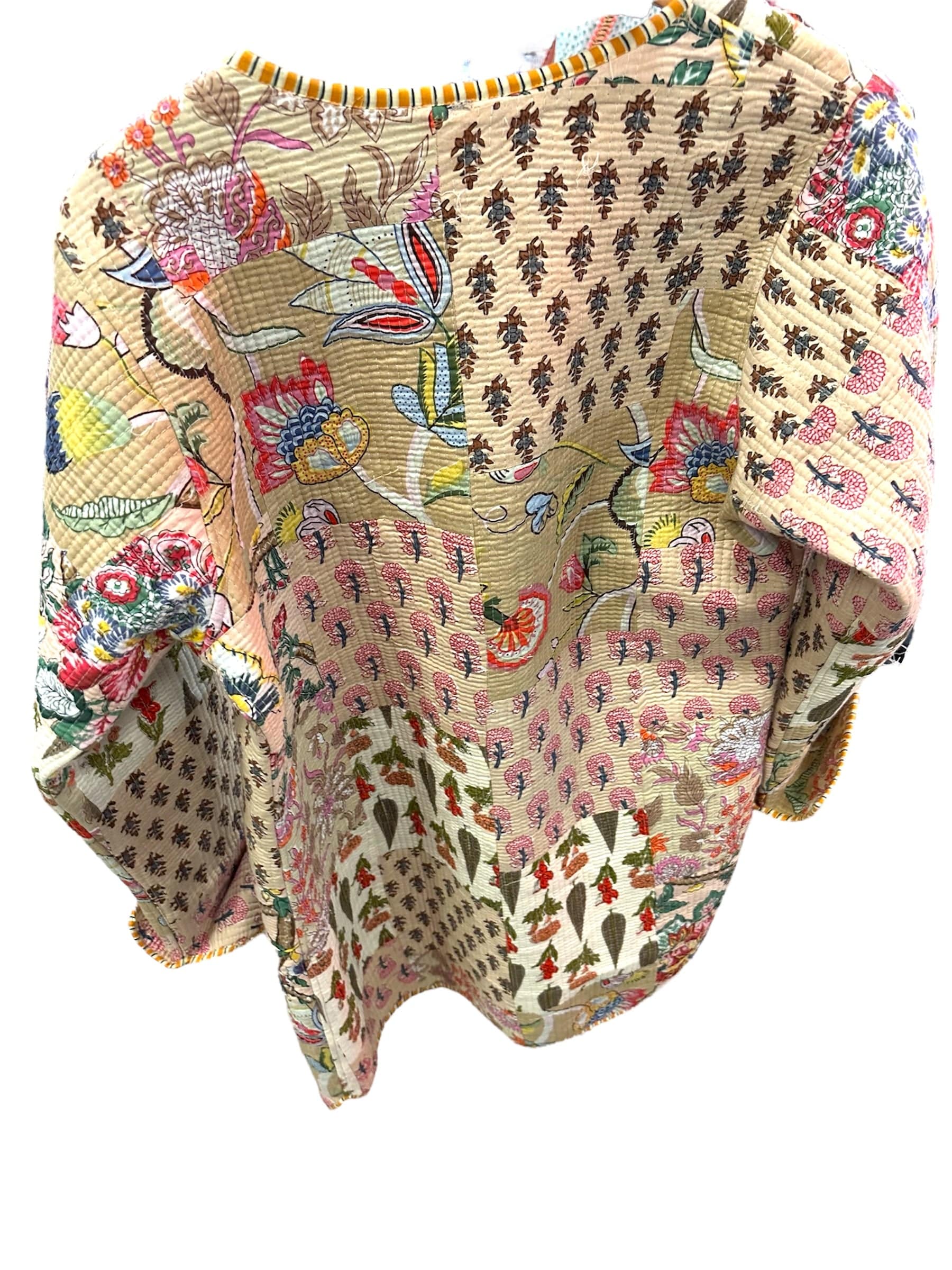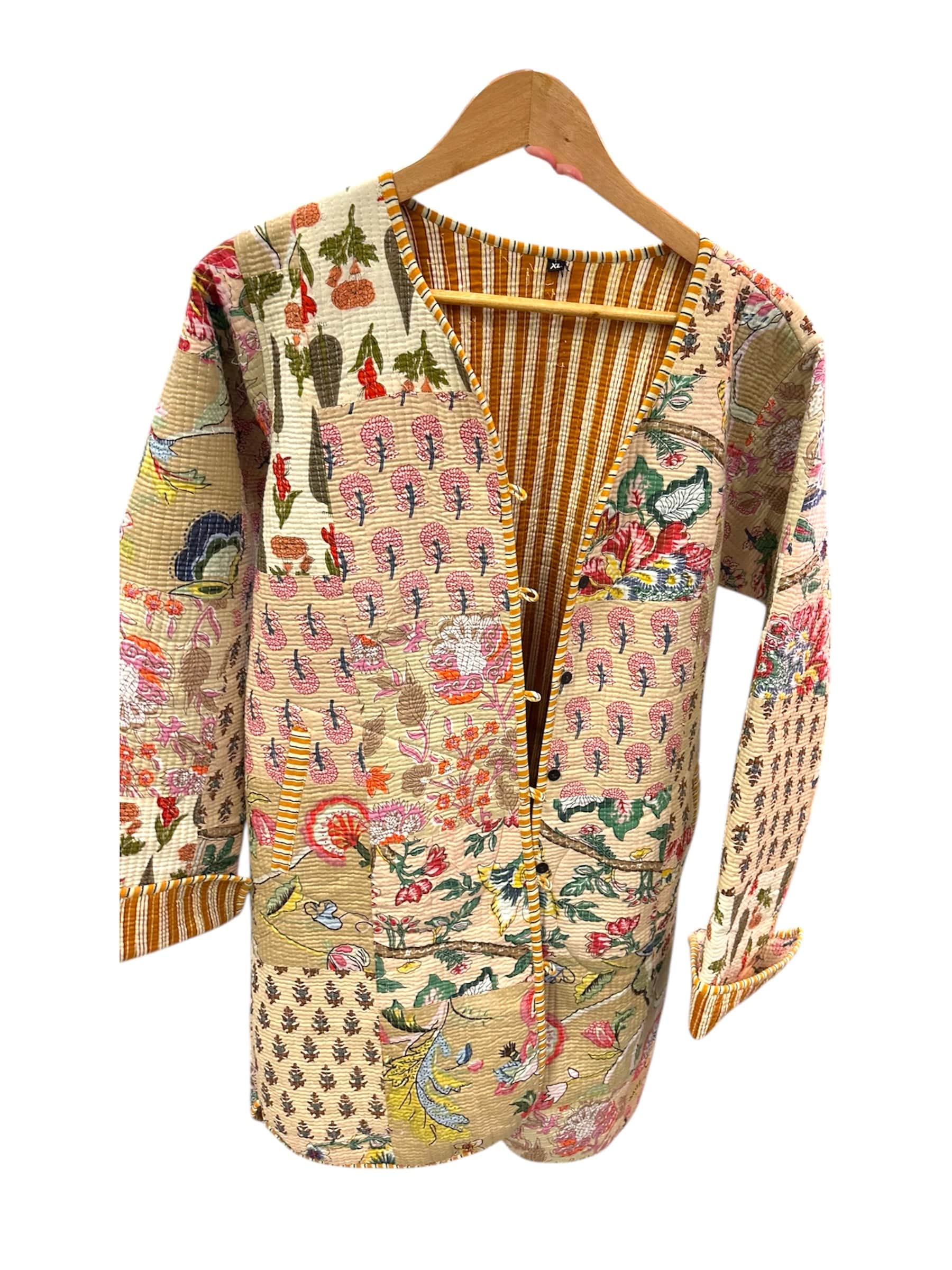 This fun reversible jacket showcases traditional kantha stitching crafted in India! Flip it inside out for two stylish looks, each featuring convenient patch pockets. The eye-catching contrast fabric trim adds flair, while button closures keep your look secure. Mix and match with different outfits for endless fashion possibilities!