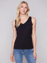 Introducing the Reversible Camisole by Charlie B, a classic and versatile addition to your wardrobe. This soft and comfortable cami features a u-neck on one side and a v-neck on the other, making it perfect for any outfit. With its wide straps and elegant black color, this camisole is a must-have for any fashion forward individual.