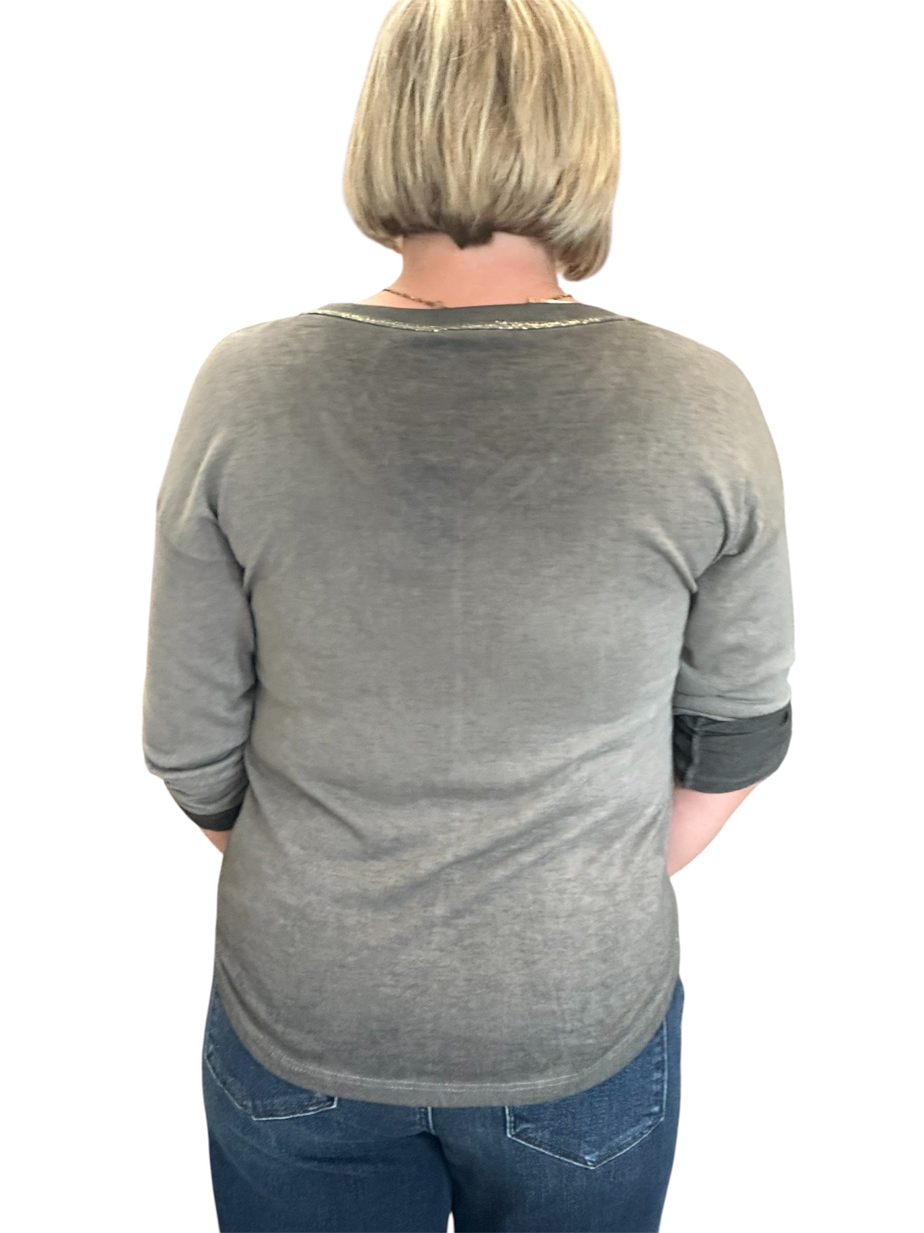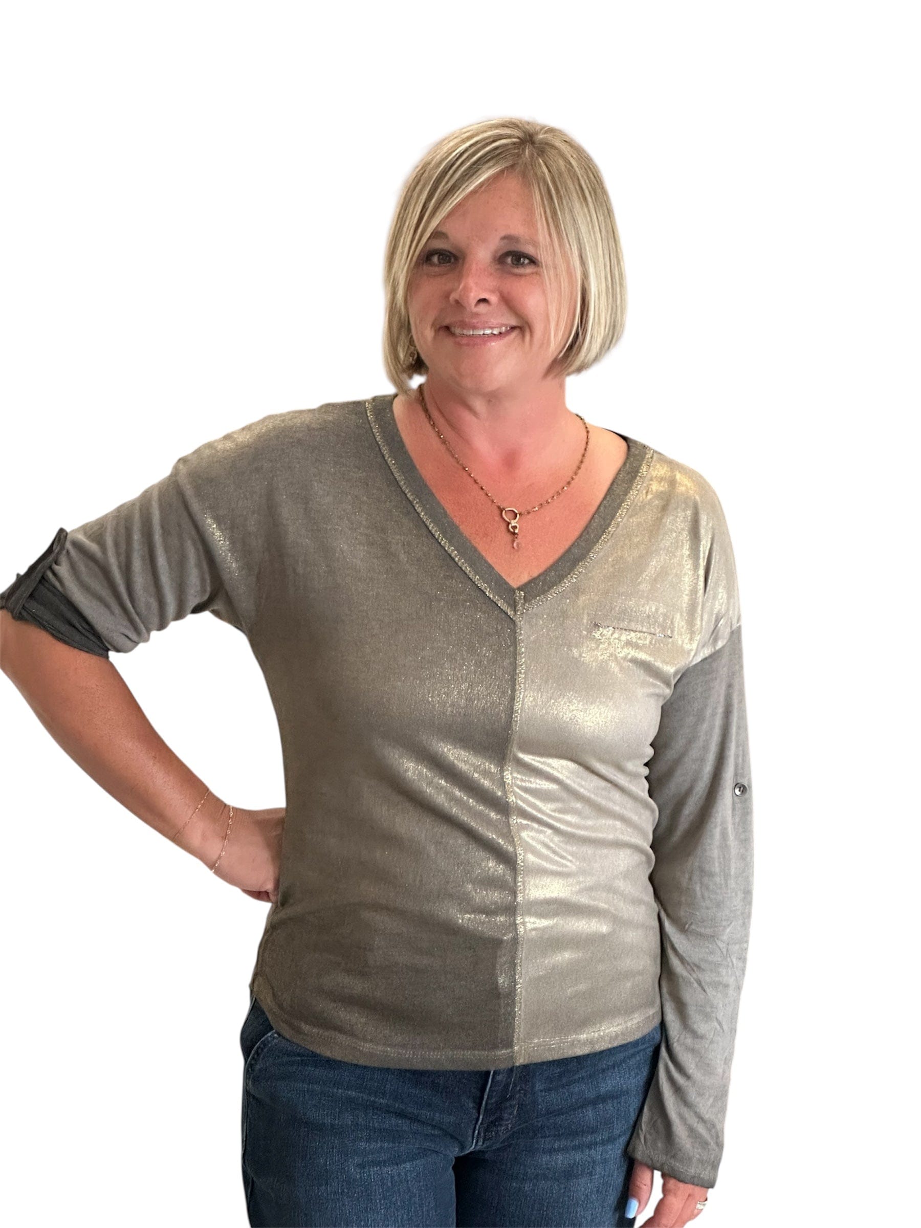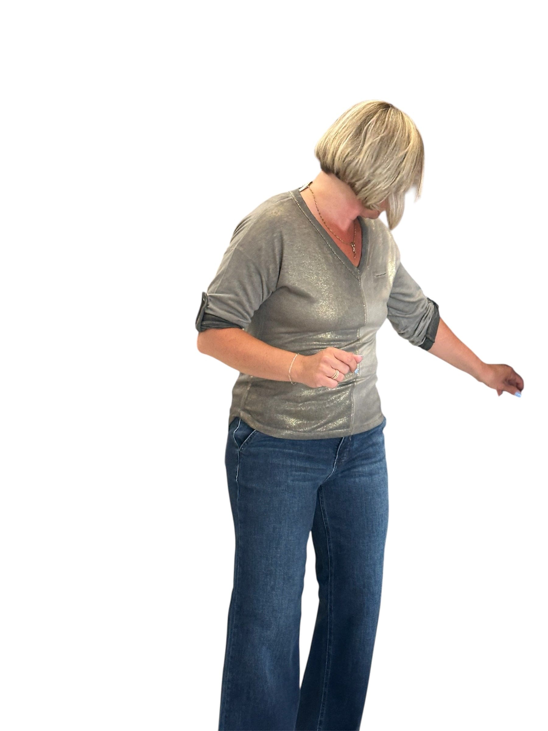 Elevate your everyday style with this playful V-Neck Mocha Sparkle Knit, crafted in Italy. Featuring a chic v-neckline, roll-up long sleeves, and a subtle gold shimmer, it adds just the right amount of sparkle to your look. The faux pocket detail and hi-lo hem bring a fun twist to a cozy favorite, perfect for turning heads wherever you go.