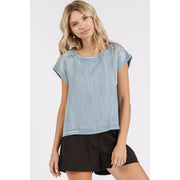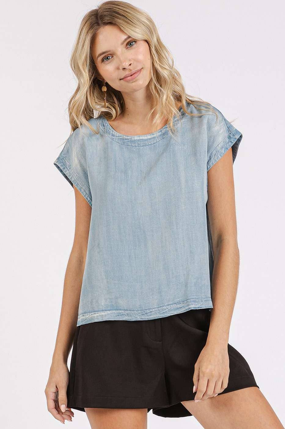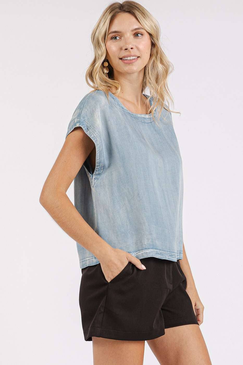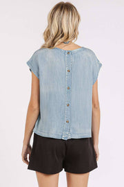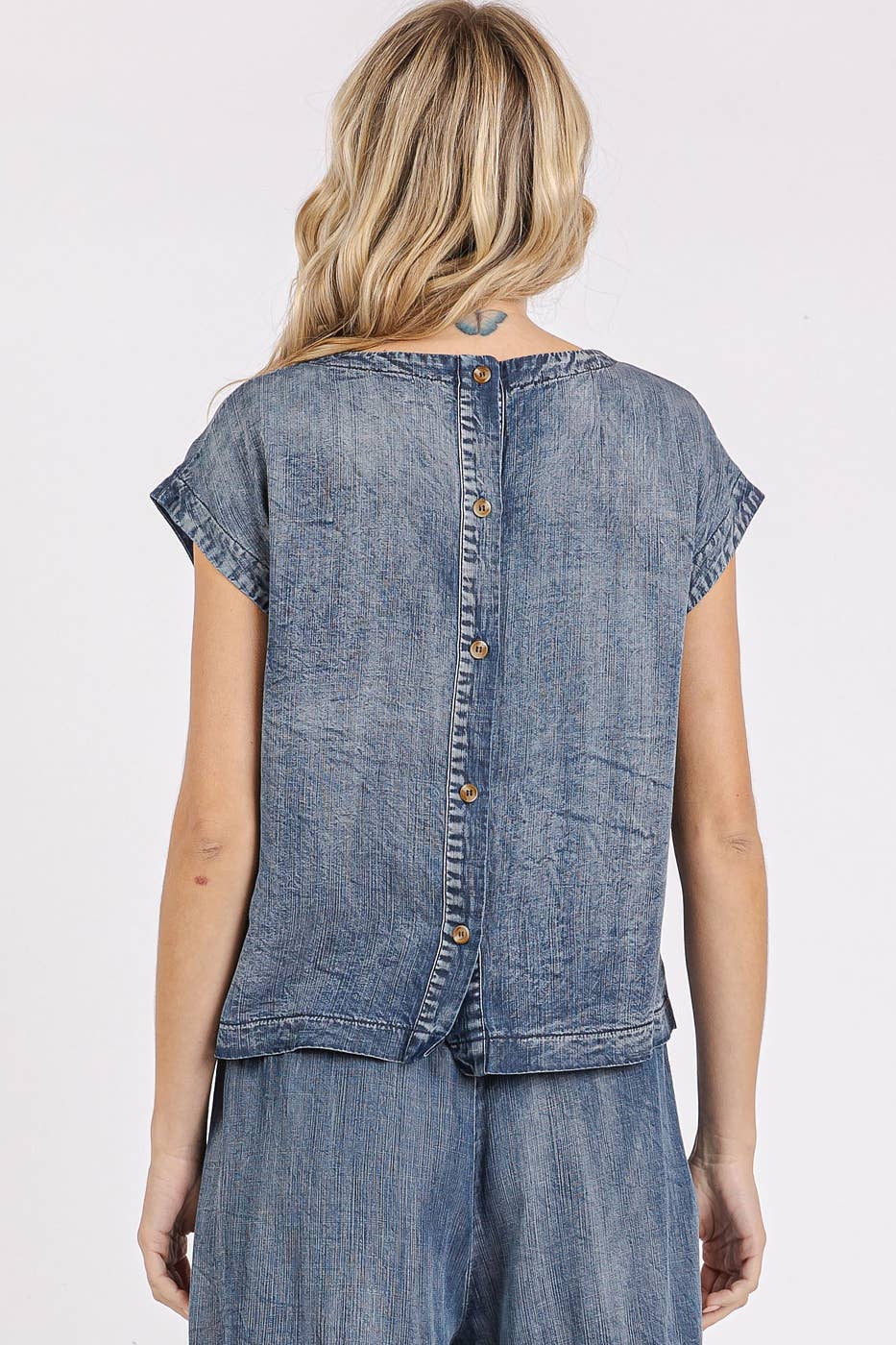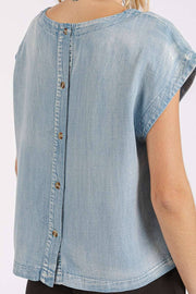 Made with soft and sustainable Tencel chambray fabric, this top features a round neck and short cap sleeves. But what really sets it apart is the unique button up detail on the back, giving it a touch of bohemian charm. Perfect for any occasion, this regular fit top will have you feeling effortlessly stylish. (Boho-chic approved!)