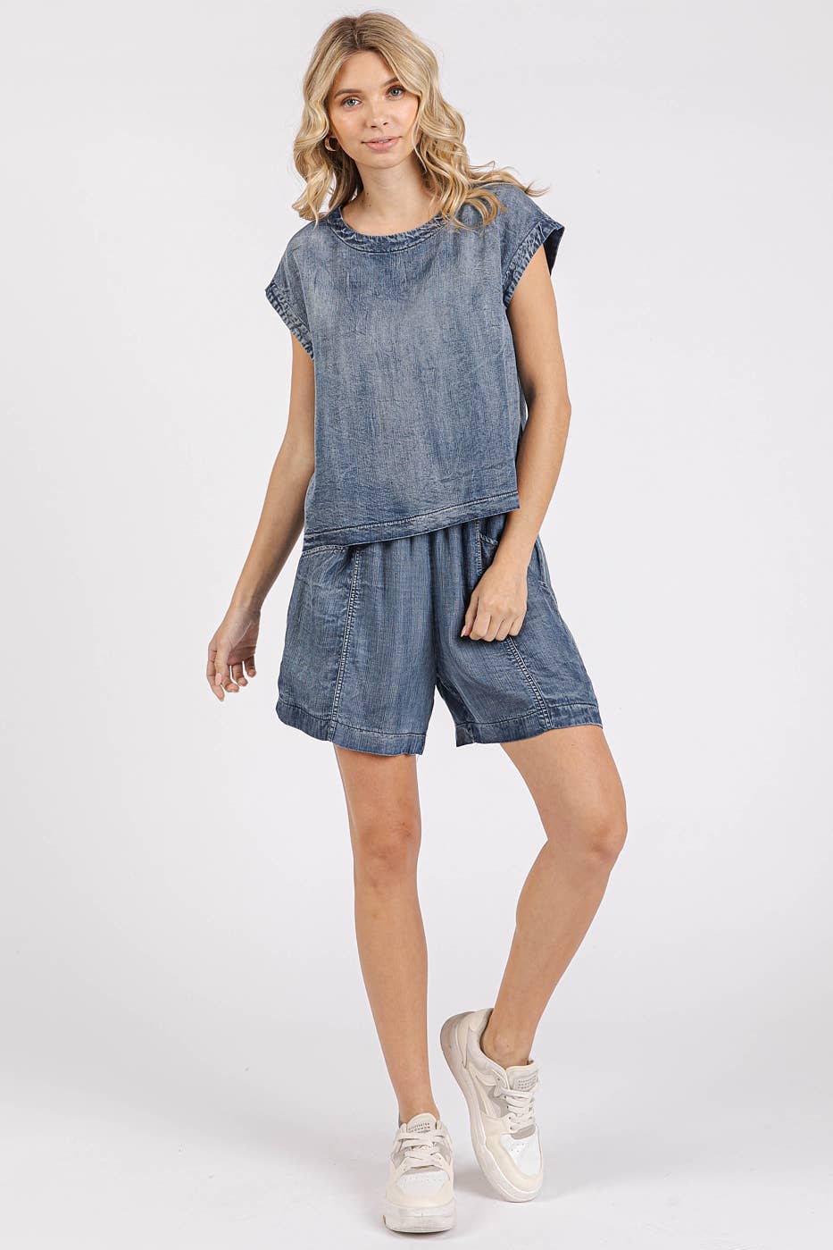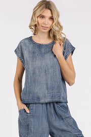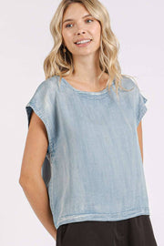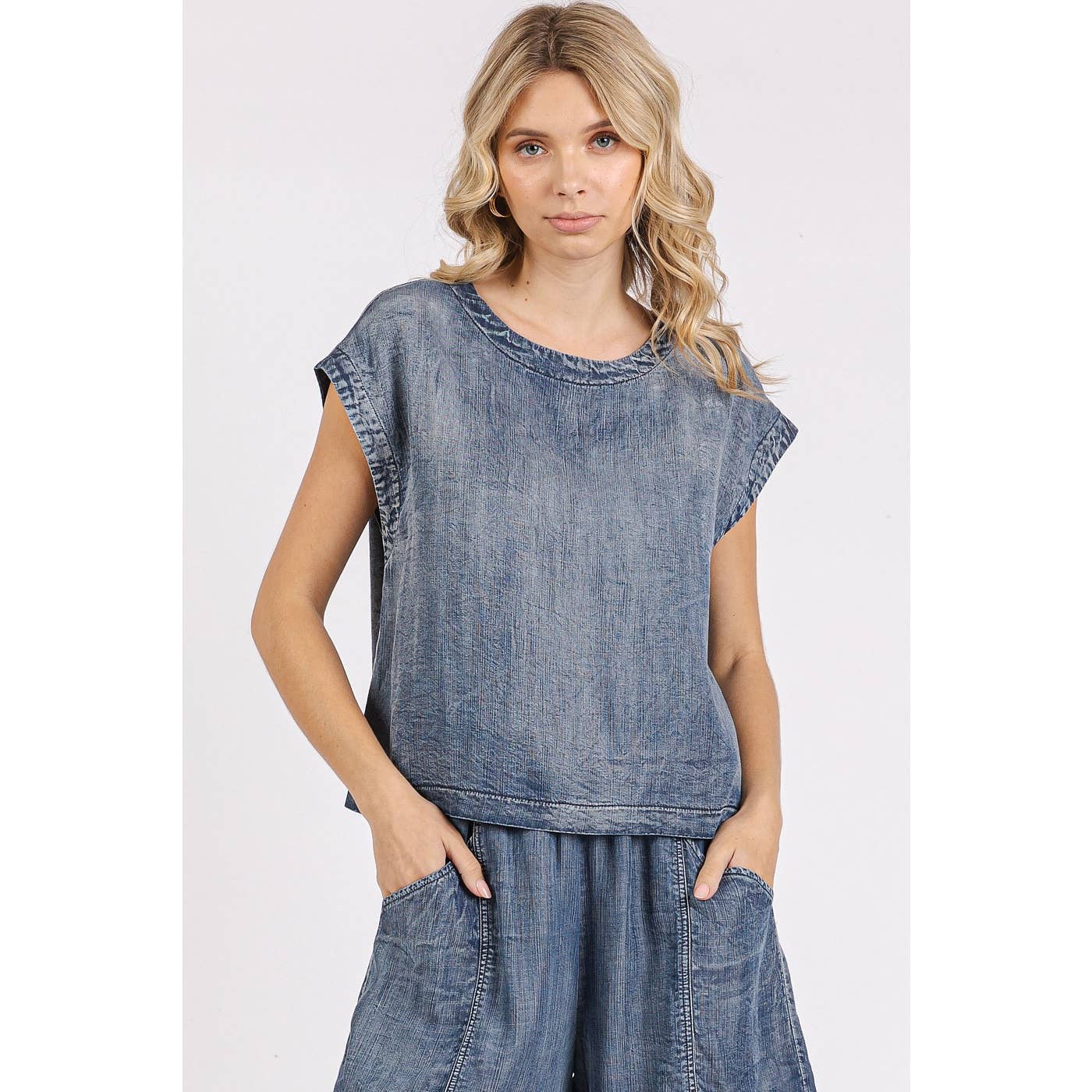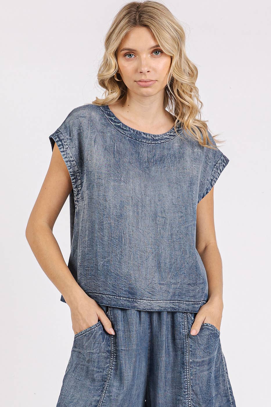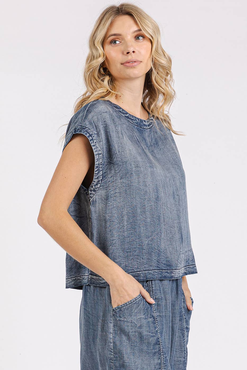 Made with soft and sustainable Tencel chambray fabric, this top features a round neck and short cap sleeves. But what really sets it apart is the unique button up detail on the back, giving it a touch of bohemian charm. Perfect for any occasion, this regular fit top will have you feeling effortlessly stylish. (Boho-chic approved!)